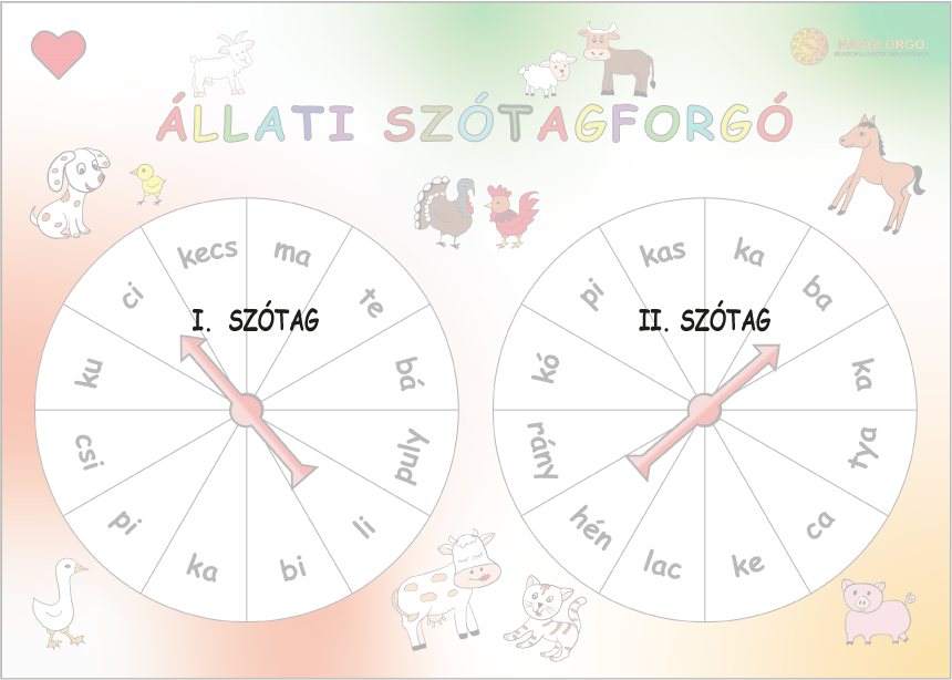 A két forgón kétszótagú állatnevek vannak, az első szótag az bal oldalin, a második szótag a jobb oldalin.