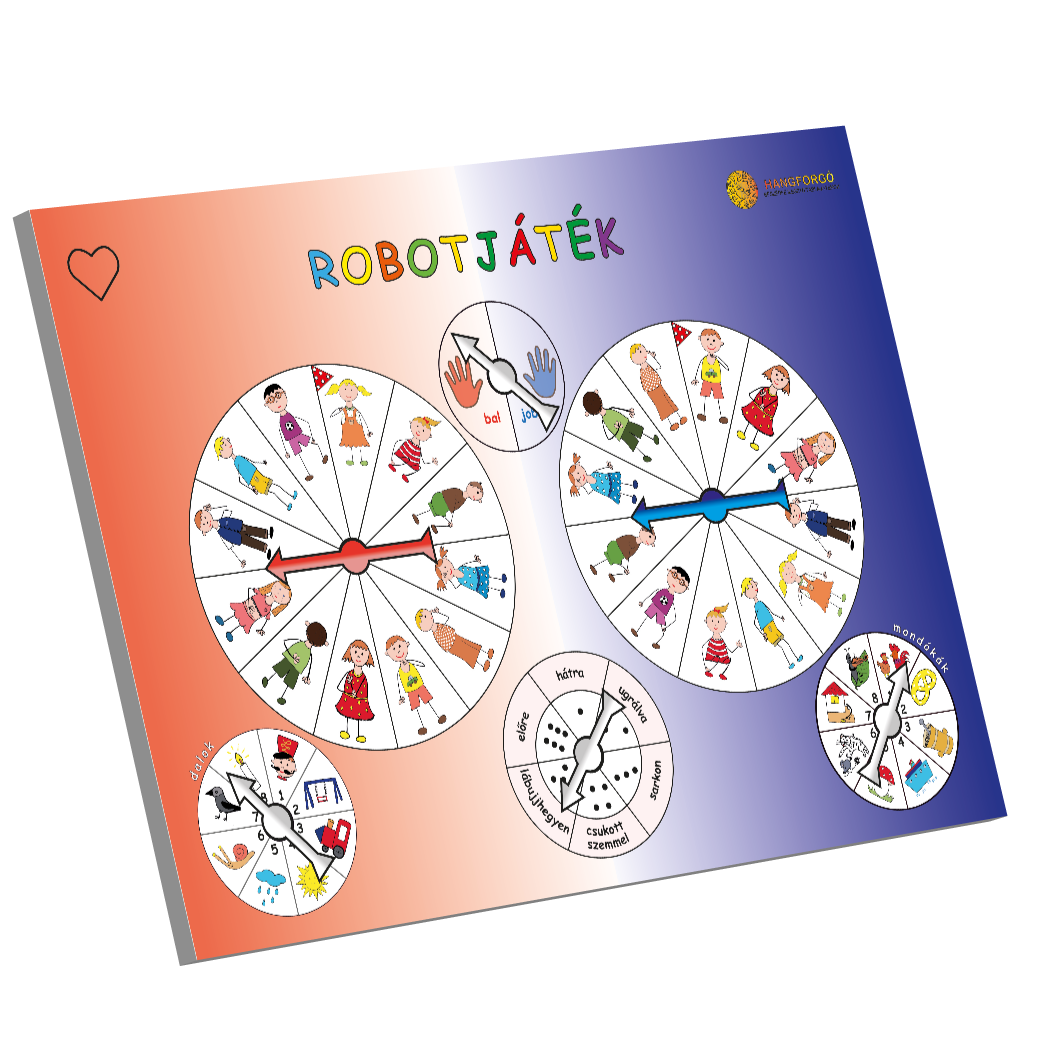 A SZÁMFORGÓ külső peremén lévő szavak további feladatlehetőségeket jelenthetnek. Így meghatározhatjuk, hogy előre, hátra, lábujjhegyen, vagy csukott szemmel végezze a gyermek a vonulást.