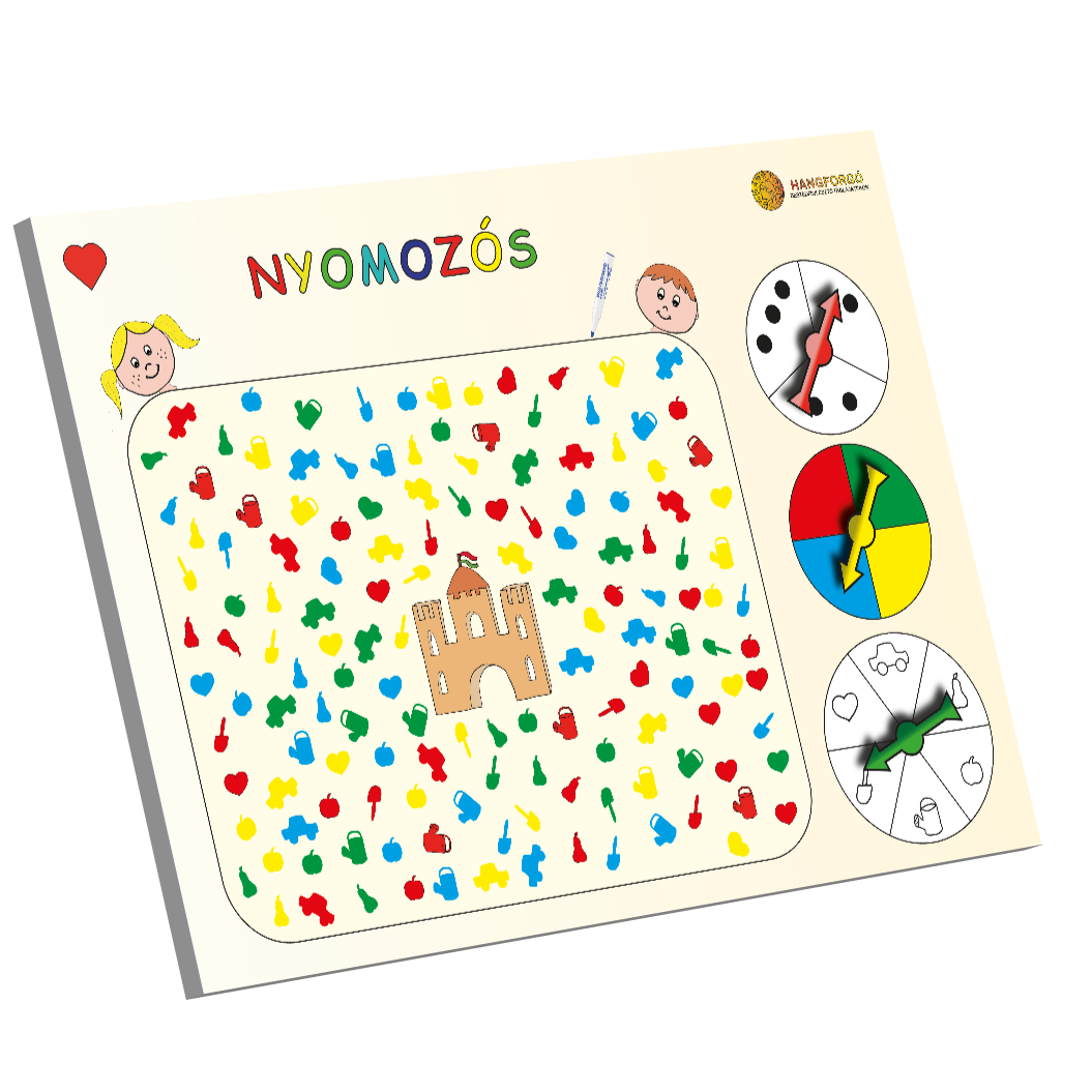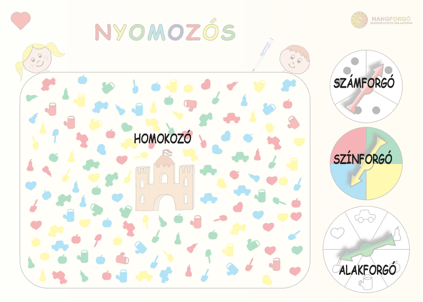 Ehhez megpörgetjük a SZÁMFORGÓT a SZÍNFORGÓT és az ALAKFORGÓT, és megkeressük az így meghatározott formákat (pl. három piros szív) és bekarikázzuk őket a letörölhető filctollal.