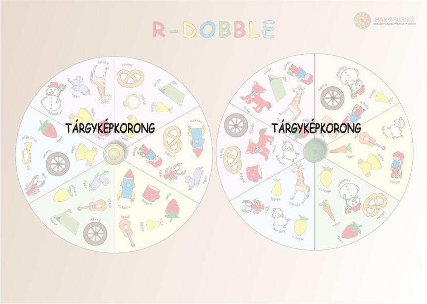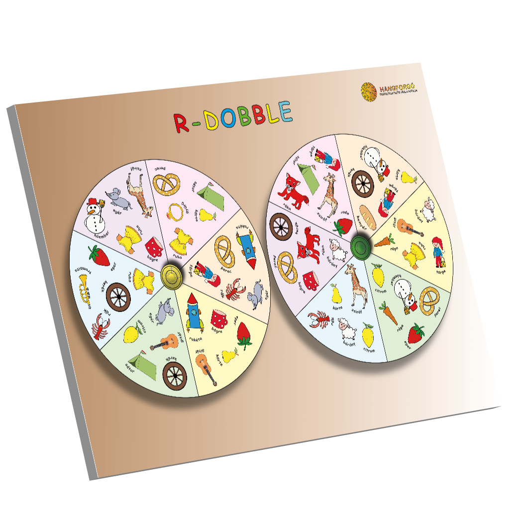 A „R-DOBBLE” játék központi elemei a forgatható korongok, melyeken R hangot tartalmazó szavak vannak olyan módon, hogy a közismert Dobble-játék elvéhez hasonlóan, bármelyik két körcikk találkozásakor van azonos ábra (szó).