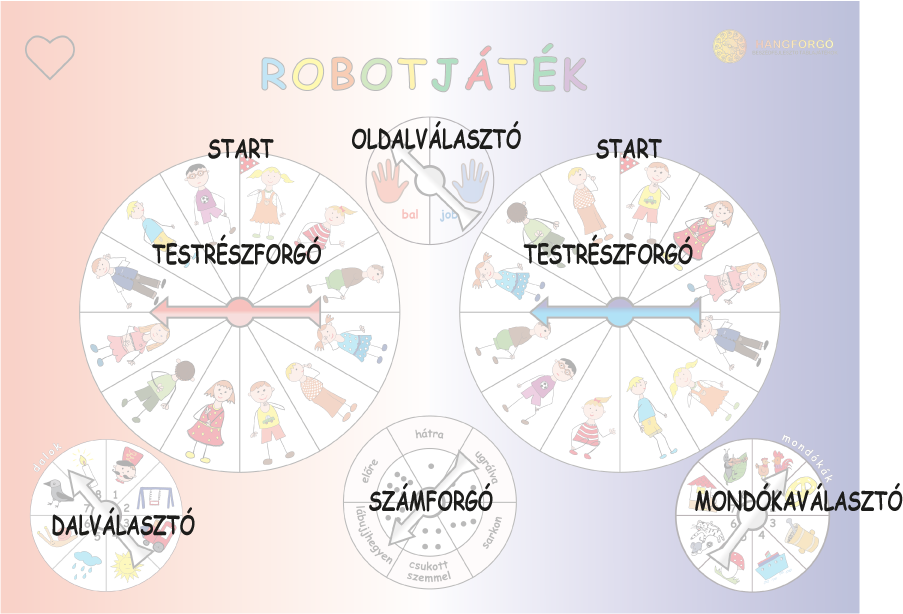 A SZÁMFORGÓ külső peremén lévő szavak további feladatlehetőségeket jelenthetnek. Így meghatározhatjuk, hogy előre, hátra, lábujjhegyen, vagy csukott szemmel végezze a gyermek a vonulást.