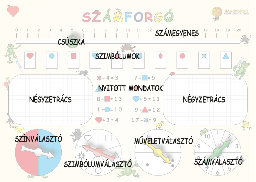 Ezután jönnek a pörgetések. Az alul található négy forgót megpörgetve alakul ki a feladat. Az ábrán látható nyíl-állás esetén a következő feladatot kaptuk: kék szív osztva kettővel. Mivel a nyitott mondatból kitalálható, hogy a kék szív értéke 6, ezért a négyzetrácsos részre felírjuk a feladatot: 6:2=?, majd kiszámoljuk.